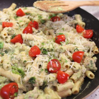 Avocado pesto pasta using fresh ingredients and chickpea pasta.