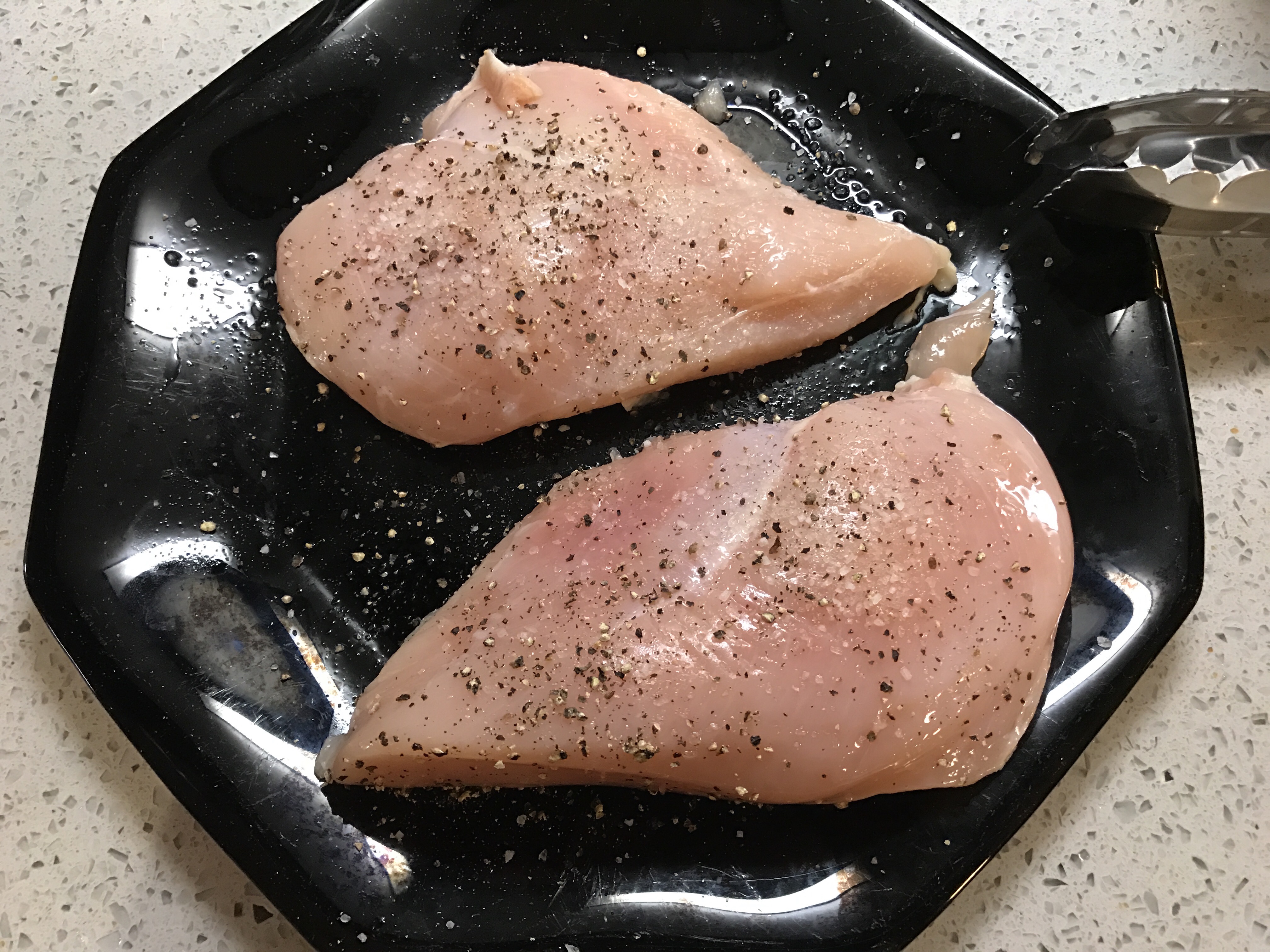 - Season chicken breast on both sides with salt and pepper, use tongs to flip.