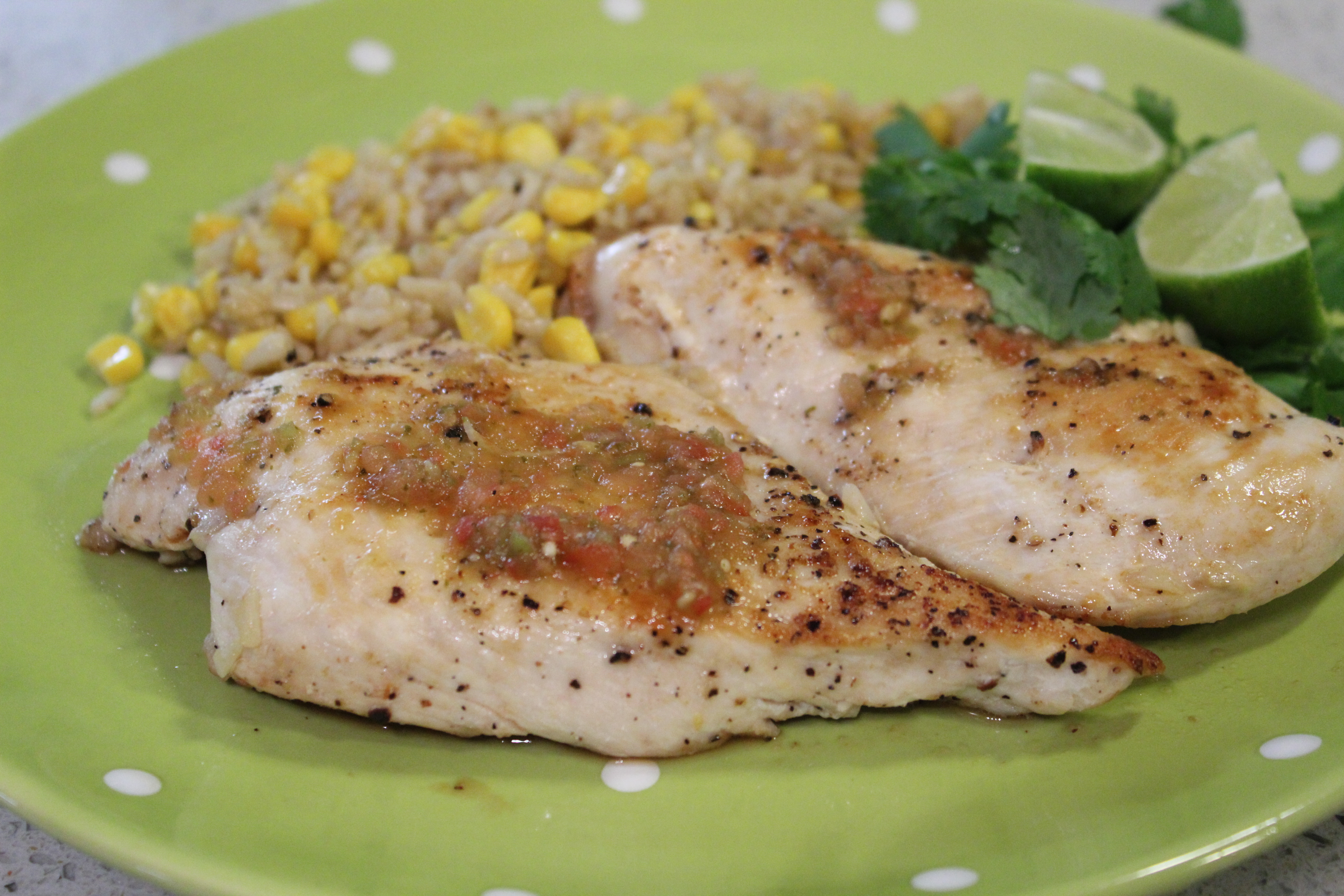 - Pour salsa over chicken and garnish with limes and cilantro.