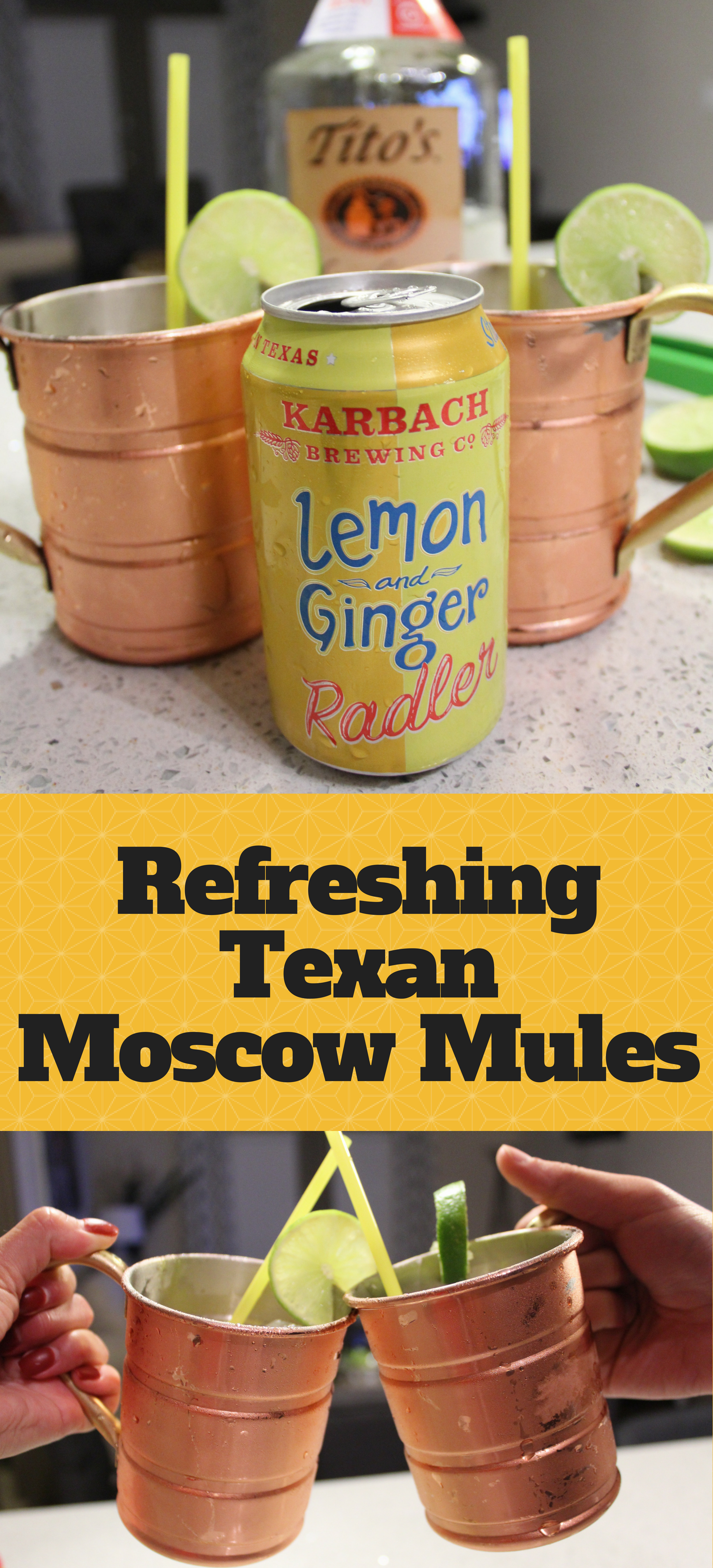 Karbach released their Lemon Ginger Radler this year and I have been hooked ever since! This Texas girl loves Texas things, and there’s no exception when it comes to my weekend adult beverages! My Moscow Mules are refreshing and perfect for summer, so grab a couple copper mugs and let’s get to stirring!